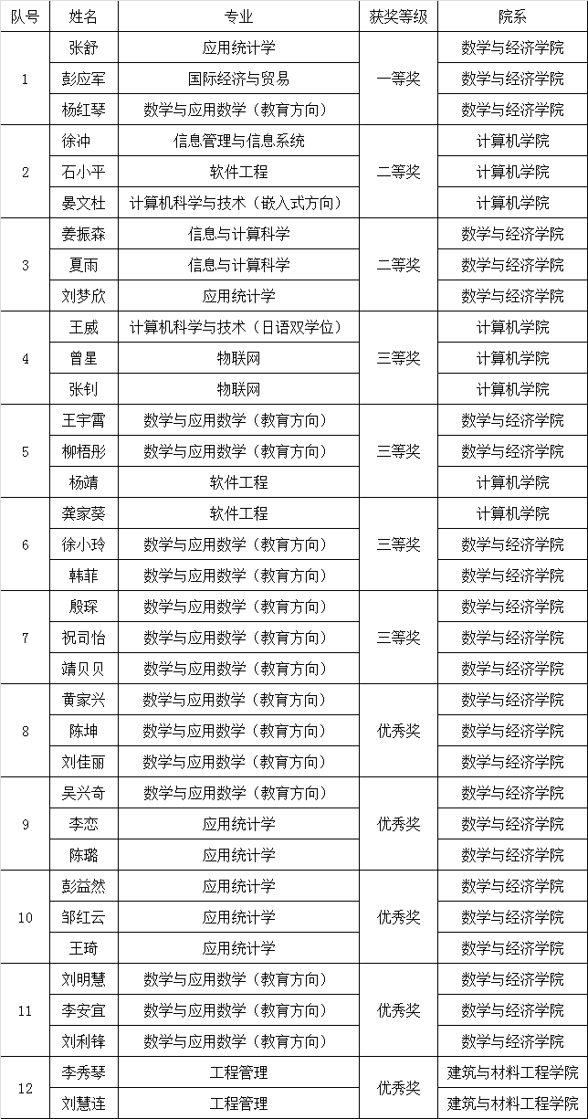 为了选拔优秀选手参加“2016高教社杯”全国大学生数学建模竞赛;同时为了激励我校学生学习数学的积极性,提高大学生建立数学模型和运用计算机技术解决实际问题的综合能力,培养创新精神及协作意识。由教务处主办、数学与经济学院承办,于2016年5月19日至5月30日举行了湖北第二师范学院第三届大学生数学建模竞赛。此次竞赛共评出一等奖1队、二等奖2队、三等奖4队、优秀奖5队。学校对获奖同学予以表彰,希望获奖同学再接再厉,在今后的学习和竞赛活动中再创佳绩。