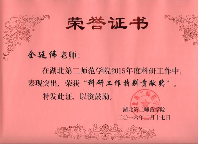 全廷伟老师荣获湖北第二师范学院2015年度“科研工作特别贡献奖”