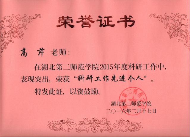 高芹老师荣获湖北第二师范学院2015年度“科研工作先进个人”
