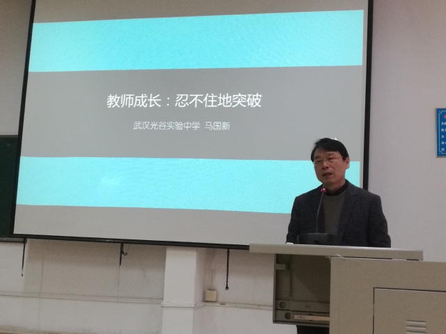 本网讯(见习记者 杨鑫 严梦龙禧)11月8日下午,以“教师成长:忍不住的突破”为主题的讲座在三号报告厅举行。武汉光谷实验中学校长马国新应邀来我校主讲,数学与经济学院数学系主任吴新林主持讲座。