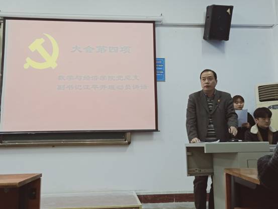 会议第一项,全体起立,奏唱国歌!会议第二项,学生党员代表陈诗敏发言。陈诗敏同学在发言中指出一个人只有建立了自己人生道路上的正确理想才不至于使自己的人生轨迹偏航,才不至于犯错误!组织上的入党一生一次,思想上的入党一生一世!每个人都应该端正入党动机,为同学们服务,为人民服务,为社会服务!会议第三项,培训班学员代表曾琪珺发言。曾琪珺同学表明希望通过这次培训班的学习使自己在思想上和理论上有新的提高。曾琪珺代表全体入党积极分子郑重承诺:以最饱满的热情、最全面的投入、最实际的行动完成党校学习!会议最后一项,数学与经济学院党总支副书记汪平书记作动员讲话。汪平书记指出入党积极分子培训班是对学生进行系统思想教育的有效方法!同时汪平书记在发言中对入党积极分子提出了如下要求:加强党的理论知识的学习。牢记共产党员的信念,把自己的人生追求同祖国和民族的前途命运紧密联系起来。学做合一,从根本上了解党,从情感上热爱党,从行动上追随党!