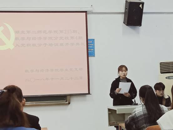 会议第一项,全体起立,奏唱国歌!会议第二项,学生党员代表陈诗敏发言。陈诗敏同学在发言中指出一个人只有建立了自己人生道路上的正确理想才不至于使自己的人生轨迹偏航,才不至于犯错误!组织上的入党一生一次,思想上的入党一生一世!每个人都应该端正入党动机,为同学们服务,为人民服务,为社会服务!会议第三项,培训班学员代表曾琪珺发言。曾琪珺同学表明希望通过这次培训班的学习使自己在思想上和理论上有新的提高。曾琪珺代表全体入党积极分子郑重承诺:以最饱满的热情、最全面的投入、最实际的行动完成党校学习!会议最后一项,数学与经济学院党总支副书记汪平书记作动员讲话。汪平书记指出入党积极分子培训班是对学生进行系统思想教育的有效方法!同时汪平书记在发言中对入党积极分子提出了如下要求:加强党的理论知识的学习。牢记共产党员的信念,把自己的人生追求同祖国和民族的前途命运紧密联系起来。学做合一,从根本上了解党,从情感上热爱党,从行动上追随党!