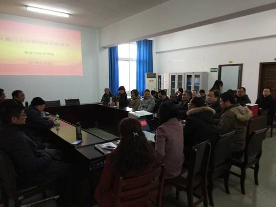 1月3日下午,数学与经济学院 “从教三十周年”座谈会在10号教学楼学院研究中心10211召开。院长肖海燕、党总支副书记汪平、副院长李海雄、院长助理常静参加。党总支书记刘原主持。各系主任、三办主任、教师代表参加会议。