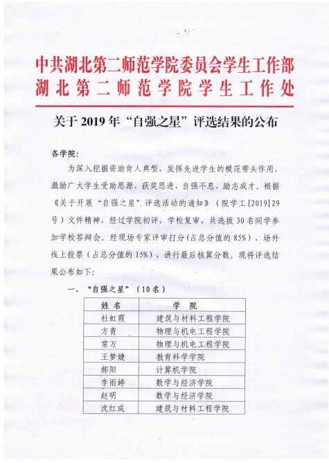 在10月到11月期间,湖北第二师范学院为评选品德高尚,在学习、实践等方面表现突出,对青具有示范引领作用的优秀大学生展开了“自强之星”评选活动。数学与经济学院参与评选的4名同学经过了学生自荐,学院初评,学校评选等层层选拔最后全部上榜,其中李雨婷同学和赵明同学被评为“自强之星”,张兰同学和陈雪珍同学获得此次活动的提名奖。