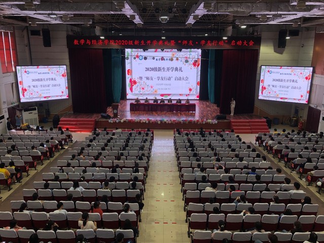 (通讯员 王聪)10月8日下午,数学与经济学院2020级新生开学典礼暨“师友·学友行动”启动大会在学校大礼堂举行。数学与经济学院分党委书记钟建国、院长肖海燕,质量评估处处长何京敏、副处长殷仲海出席,学院分党委副书记汪平主持会议。