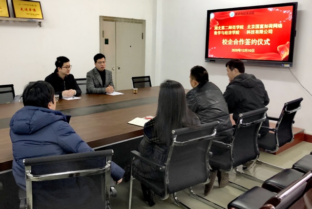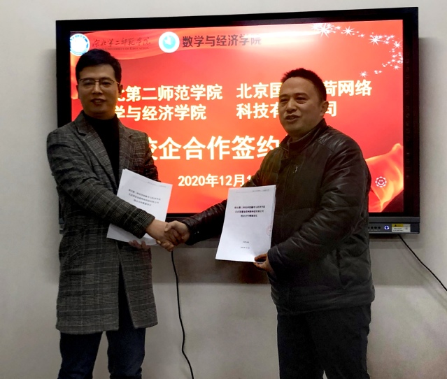 12月10上午,湖北第二师范学院数学与经济学院与北京国富如荷科技有限公司在学院研究中心成功举行校企合作签约仪式。学院分党委书记钟建国,院长肖海燕,副院长李海雄以及院长助理胡颖博士出席本次仪式。