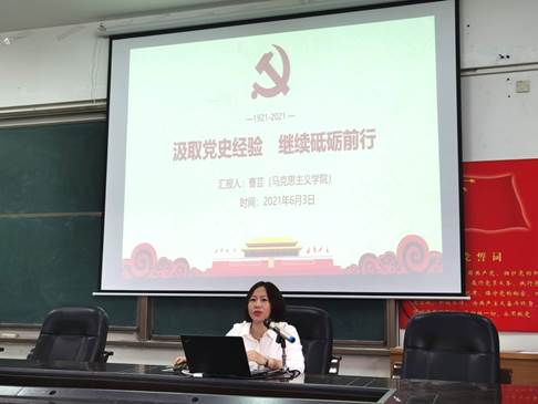 最后,曹芸老师以“千秋伟业,百年只是序章,保持永不懈怠的精神状态和一往无前的奋斗姿态,中国共产党定能奏响民族更加壮丽的乐章”结束本次宣讲报告。