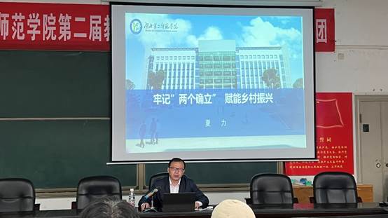 夏力以《牢记“两个确定” 赋能乡村振兴》为题,从历史背景、目标与任务、组织与落实等方面来展开论述教育在乡村振兴中的重要作用。