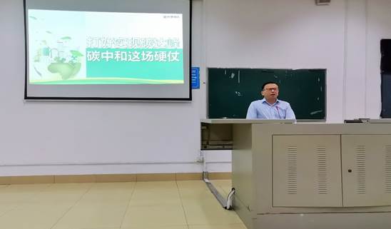 接着,他从“双碳行动迫在眉睫”、“双碳基础不断夯实”及“双碳发展坚定不移”三方面为同学们进行讲解。其中在提及《巴黎协定》时,他告诉我们我国高度重视应对气候变化国际合作,并于2020年9月在第75届联合国大会上正式提出“2030年实现碳达峰2060年实现碳中和的目标”。他表示我们应一手抓发展、一手抓环保,着力减少生产生活必要的碳排放总量和强度的同时,大力减少空气中的二氧化碳存量,让碳排放量与碳吸收量达到动态平衡从而真正实现“零碳”未来。