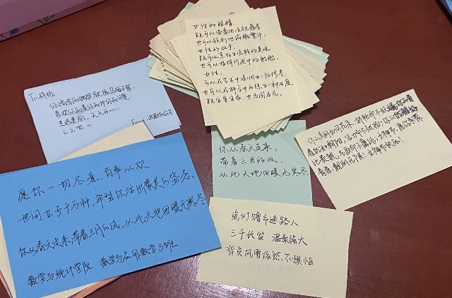 活动期间,在各班宣传委员的宣传下,各班级同学踊跃投稿,一展青春文采,在卡片上写下对身边女神的祝福。在学生会成员的协助下,宿管阿姨将各班的祝福卡片以抽奖盲盒的形式分发,将祝福传递给每一位同学。