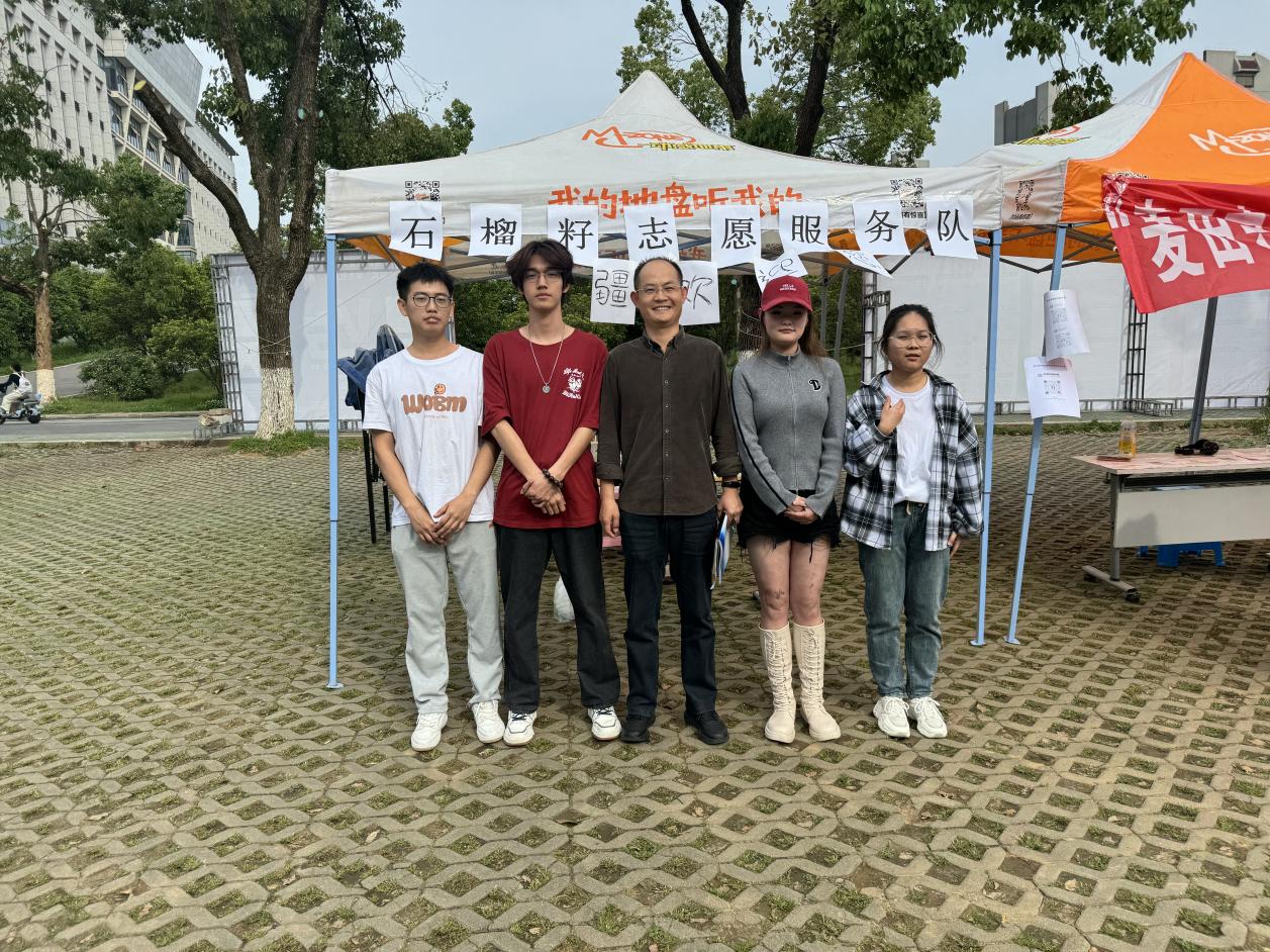 本网讯(通讯员 汪熠琳 马静萱)4月18日下午,我院“麦田守望者”志愿服务队、“石榴籽”爱心服务团于我校大礼堂外侧开展暑期三下乡社会实践展示宣传活动,数学与统计学院党委书记林志红、院长肖海燕、党委副书记严国涛、学工办主任余江涛莅临现场指导工作。
