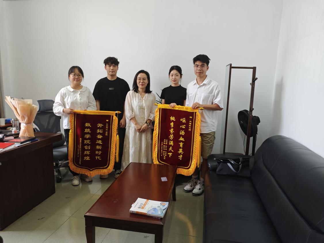 本网讯(通讯员 姚颖)5月8日下午,以付婧怡、方智辉为代表的四位湖北大学大考研上岸学子为数学与统计学院(以下简称“数统院”)和院长肖海燕赠送锦旗。