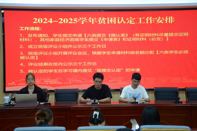 会议伊始,陈心语介绍了资助政策和申请流程,并对资助文件进行了解读。随后,她对家庭经济困难认定工作的开展做出安排,要求全体人员认真做好资助工作,让真正有需要的学生能够得到及时有效的帮助。最后,陈心语从材料提交、评估指标、截止日期以及注意事项等方面做出讲述,明确工作细则,确保资助工作顺利开展。