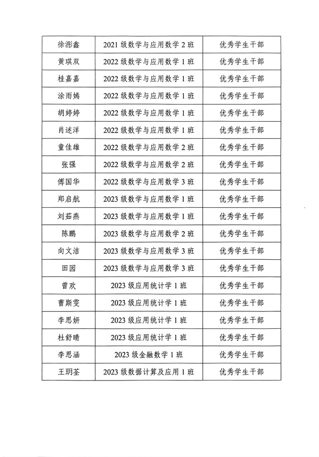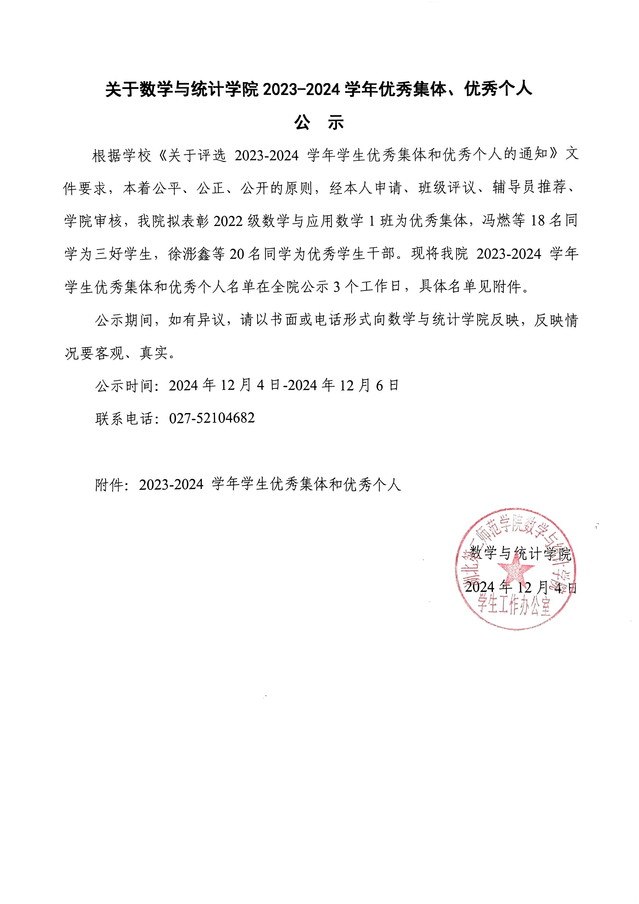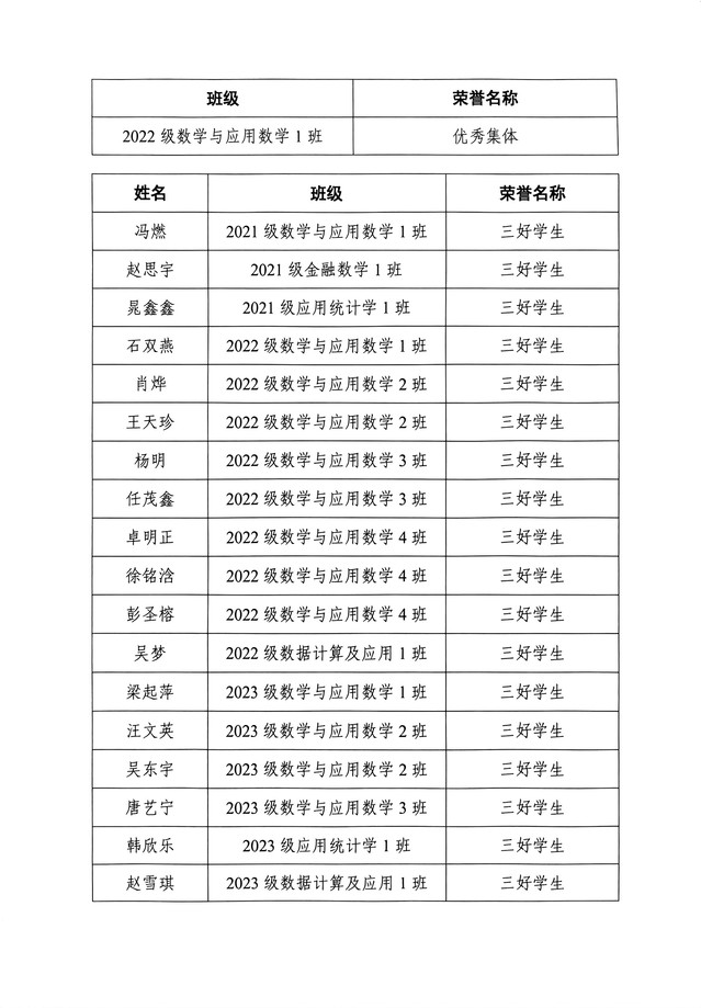 关于评选数学与统计学院2023-2024学年优秀集体、优秀个人名单公示