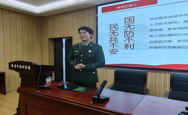 活动伊始,郑启航播放国防安全视频,向同学们展示我国国防发展现况。接着,他借助英雄事迹向同学们传授国防教育知识,以增强同学们的爱国情怀。随后,他结合个人经历向同学们讲解国家征兵政策。最后,郑启航与同学们进行互动交流,进一步加深同学们对国防教育的认识。