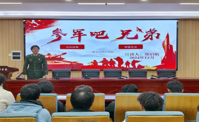 本网讯(通讯员 夏聪)为加速推进国家安全防范工作的实施,并着力提升同学们的国防观念与意识,12月12日,数学与统计学院在十号楼二楼会议室开展国防教育暨征兵宣讲活动,数学与统计学院2024级各班男生参加本次活动,活动由2023级数学与应用数学1班郑启航主讲。