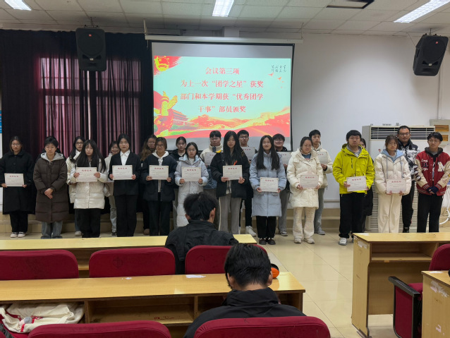 本网讯(通讯员 胡旭)为总结本学期团学组织各部门的工作,提高团学组织的凝聚力和影响力,并表彰优秀的部门与部门成员,12月22日,数学与统计学院在旧报告厅2开展团学组织部门“团学之星”评选活动。数学与统计学院团委学生副书记涂雨嫣、肖述洋,学生会执行主席桂嘉嘉,学生会主席团成员陈心语、傅国华,以及团学组织各部门干部与干事参加本次活动。数学与统计学院综合办公室杨芸主持本次活动。