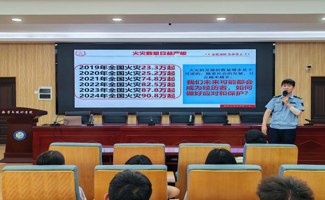 本网讯(通讯员 蔡睿琪)为增强师生消防安全意识,提升应急自救能力,4月17日,数学与统计学院在十号楼二楼会议室开展2025年“全民消防,生命至上”主题培训活动。本次活动特邀武汉市进安消防中心教官袁曈辰担任主讲,2024级学生代表参与此次活动。