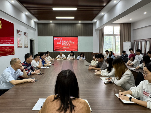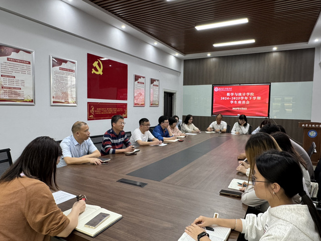 本网讯(通讯员 方瑞昕)为深入了解教学情况,加强师生交流,提升教学质量,5月8日,数学与统计学院在学院研究中心开展2024-2025学年下学期期中学生座谈会。数学与统计学院党委书记林志红,党委副书记严国涛,副院长吴新林、胡颖,院长助理张宇,各系主任,教学办主任及各班学委参加座谈会。