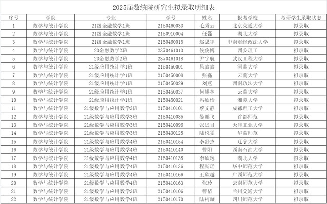 (图为2025届数学与统计学院研究生拟录取明细表)