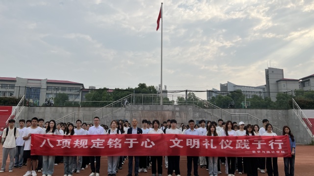 本网讯(通讯员 何兴瑶)为深入贯彻中央八项规定精神学习教育,提升大学生文明素养,5月26日,数学与统计学院在中区田径场举行升旗仪式,数学与统计学院全体辅导员,“师友·学友行动”负责人,教务处、质评中心相关领导老师,新发展党员、入党积极分子、团员及第七期青马工程全体成员参加本次活动。活动由2024级金融数学1班李伶俐主持。
