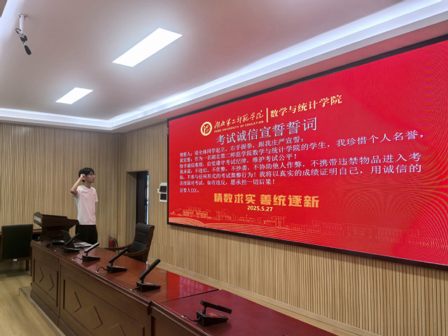 本网讯(通讯员 黄仔怡)为进一步加强大学生学风建设,培养学生诚实守信的道德品质,营造公平公正的考试环境,数学与统计学院开展诚信考试宣誓活动。数学与统计学院2024级全体学生参与本次活动。活动期间,各班认真填写2025年度诚信考试承诺书,并在学习委员领誓下,进行考试诚信宣誓活动。本次活动不仅有助于增强学生的诚信意识,促进学生在日常学习和生活中自觉践行诚信原则,还对营造良好的学风和考风起到了积极的推动作用。