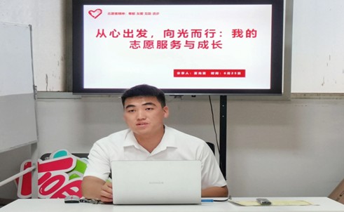 活动中,夏光亚以自身经历为切入点,讲述了通过开展爱国教育课堂、创意兴趣活动守护留守儿童的暖心实践。他感悟到志愿服务不仅淬炼了沟通协作与应急处置能力,更让他深刻体会到实践对青年成长的赋能价值。最后,他叙述志愿活动中的流程,强调“选题需锚定社会需求、筹备要注重形式创新”的实践逻辑,并号召同学们在躬身实践中挖掘潜能、突破自我。