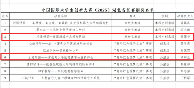 本网讯(通讯员 陈俊涛)近日,中国国际大学生创新大赛(2025)湖北省复赛圆满落幕,2022级数学与应用数学3班傅国华带领的棱镜哨位团队,2022级数学与应用数学4班卓明正带领的乐恩家园团队斩获铜牌荣誉。棱镜哨位团队成员傅国华、覃文韬、黄纯刚、李思涵、袁佳乐、陈心语、刘子钰、陈佳、杨宇琴、汪小蝶、张璐、何紫涵、顾思婕、宋雨霏、涂炎炎。乐恩家园成员卓明正、潘思晓、胡婷婷、郭子莹、田柯锐、刘荇、周静秋、陈树芳、唐艺宁、赵雪琪、付欣悦、刘文思。