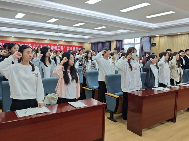 活动伊始,全体成员起立奏唱团歌。接着,组织部部长曾姝尔介绍本次团校考核制度及考核方案,并要求同学们认真学习,做好笔记。随后,第七期优秀团员代表郭静雯进行发言,她指出团校是一个提升自我的平台在上面她收获了思想、能力与信念的三重成长。并告诫同学们要珍惜学习机会,努力提升自己。接着,本期团校新学员代表向渊进行发言,他表示他会以这次团课为起点,把青马精神融进日常,既要做“提笔能写,开口能讲”的学习者,更要做“脚下有路,心中有光”的践行者。最后,向渊带领全体成员进行入团宣誓。