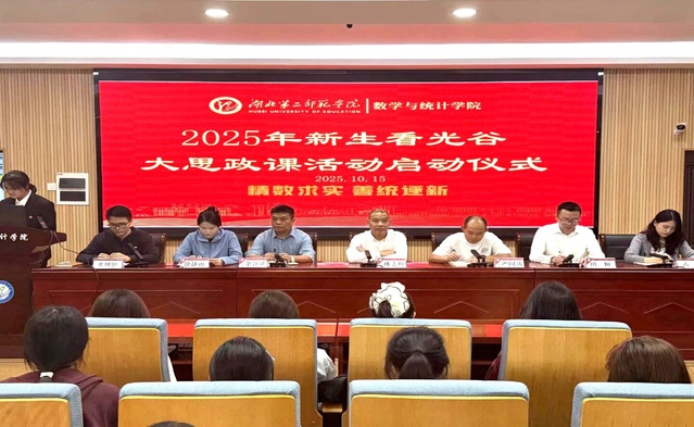 本网讯(通讯员范冰冰)为帮助新生熟悉光谷学习、生活场景,感受区域科创与发展活力,10月15日,数学与统计学院于十号楼二楼会议室开展2025年“新生看光谷”思政大课启动仪式。数学与统计学院党委书记林志红,党委副书记严国涛,学工办主任余江涛,全体辅导员,组织部全体成员,2025级新生参加本次启动仪式。