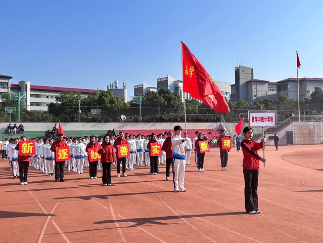 开幕式上,伴随着激昂的《运动员进行曲》,校国旗队、仪仗队、彩旗队、啦啦队、裁判员代表队、教职工代表队及各教学学院代表队依次入场。数学与统计学院方阵全体成员目光坚定,迈着整齐的步伐走向主席台。接着,舞蹈队员进行花球表演,她们手持彩球,随音乐律动变换队形。最后,师生们表演了第九套广播体操,充分展现出学院昂扬向上的精神风貌与蓬勃朝气,为本次运动会的成功举办拉开帷幕。