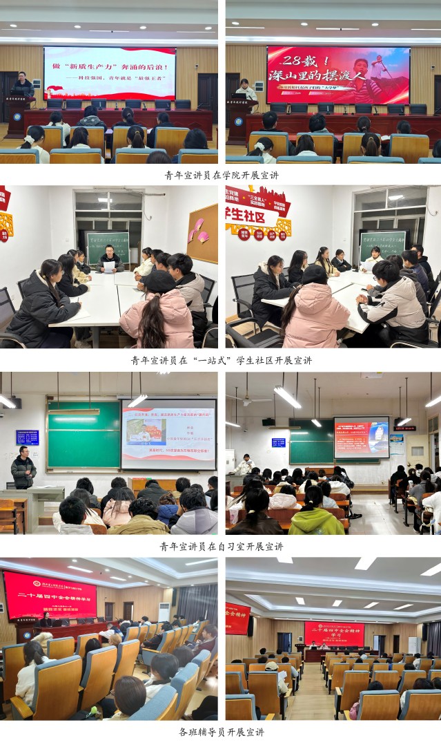 青年宣讲员田颖以《做“新质生产力”奔涌的后浪!》为题,从“时代召唤”“后浪奔涌”“自我修炼”三个方面阐述新时代青年在发展新质生产力中的责任与担当。他结合生动的案例,鼓励同学们要紧跟时代步伐,勇于创新,积极投身到国家发展的伟大事业中去。青年宣讲员向杨以《28载!深山里的摆渡人》为题,围绕全会中“统筹教育强国、科技强国、人才强国建设”的要求,鼓励同学们以王值军老师为榜样,用实际行动践行新时代教书育人的担当,在牢固知识根基、拥抱科技创新中践行青年足迹。全体辅导员则结合学院实际与学生特点,对党的二十届四中全会精神进行深入浅出的讲解,引导同学们明确学习目标,规划未来发展方向。