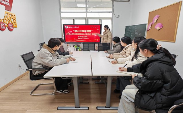 本网讯(通讯员吴紫琳)为深入学习贯彻《中华人民共和国民族团结进步促进法》,铸牢中华民族共同体意识,引导广大青年学子同心共筑中国梦,3月19日,数学与统计学院在“一站式”学生社区开展“同心共筑中国梦”——《中华人民共和国民族团结进步促进法》主题研讨会。本次活动由2023级数学与应用数学3班李坤书主讲,数理研习社成员、数统学院党员代表参加。