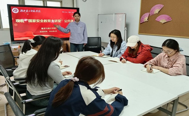 本网讯(通讯员张雨涵)为深入贯彻总体国家安全观,切实提升青年学子的国家安全意识与法治素养,筑牢校园安全防线,4月16日,数学与统计学院在“一站式”学生社区开展“观看国家安全教育大讲堂公开课”主题党日活动。本次活动由2023级数学与应用数学3班李坤书主讲,数理研习社成员、数学与统计学院党员代表参加本次活动。
