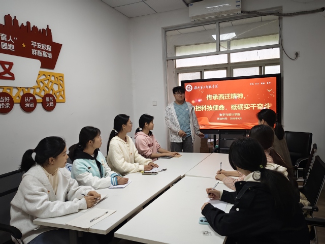 本网讯(通讯员麦丝宇)为深入学习弘扬西迁前辈艰苦奋斗的崇高精神,引导青年学子坚定理想信念、勇担时代使命,4月23日,数学与统计学院在“一站式”学生社区开展“传承西迁精神,勇担科技使命,砥砺实干奋斗”主题党日活动。数学与统计学院25级数学与应用数学4班王泓力担任主讲人,数理研习社成员、数学与统计学院党员代表参与此次活动。